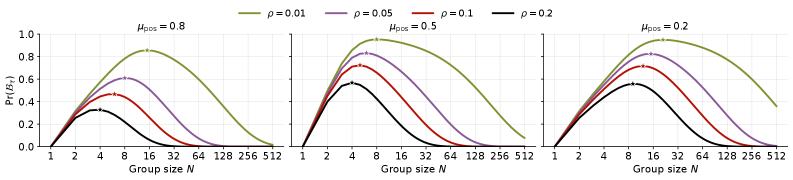 Probability that a training update is active yet misses rare-correct solutions, as a function of group size. This probability peaks at intermediate group sizes: small groups rarely produce learning signal, while large groups contain enough examples to capture rare solutions.